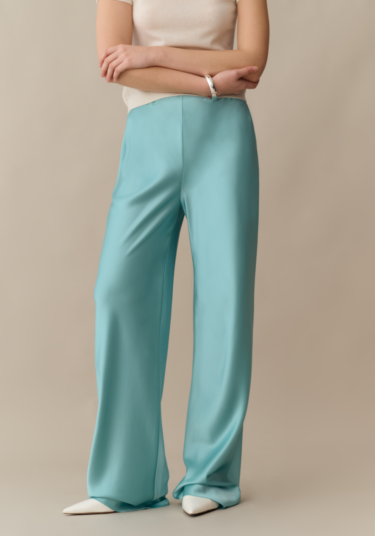 These silky trousers feature a relaxed, straight-leg silhouette that drapes beautifully with every step. Designed with a clean waistband and a subtle sheen, they balance polish with ease. Effortlessly elegant, they transition seamlessly from lounging to evenings out.