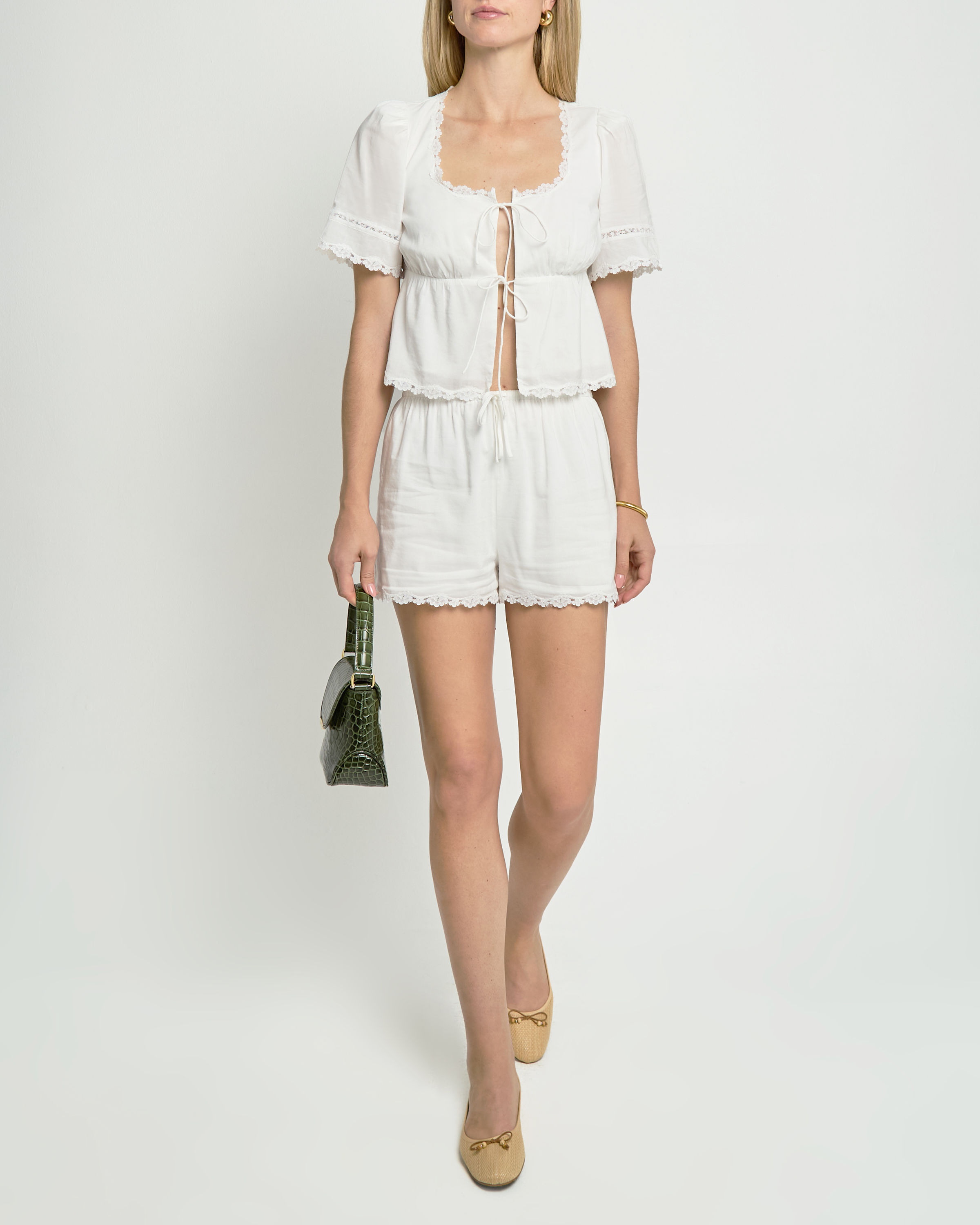 The Mira Short with its sweet lace lining and delicate tie detail add a feminine touch to any outfit. The elastic waist ensures an easy and comfortable fit, making it the perfect throw-on short. Pair it with the matching top for a complete look or a simple white tee for a casual yet chic style.