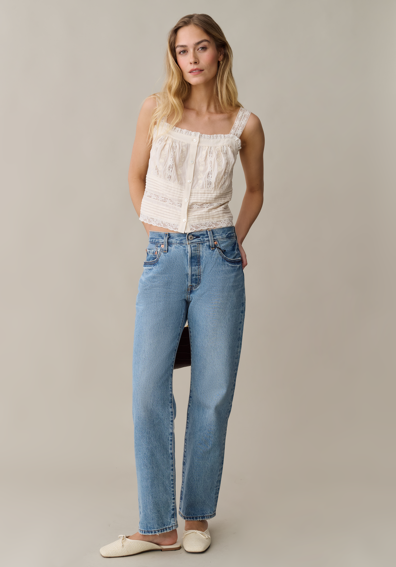 Done with a classic button-front placket and delicate lace straps, this top features an intricate mix of tonal embroidery and horizontal pintucks. The square neckline and sheer lace panels create a sophisticated, textured look that feels both vintage-inspired and effortlessly refined.