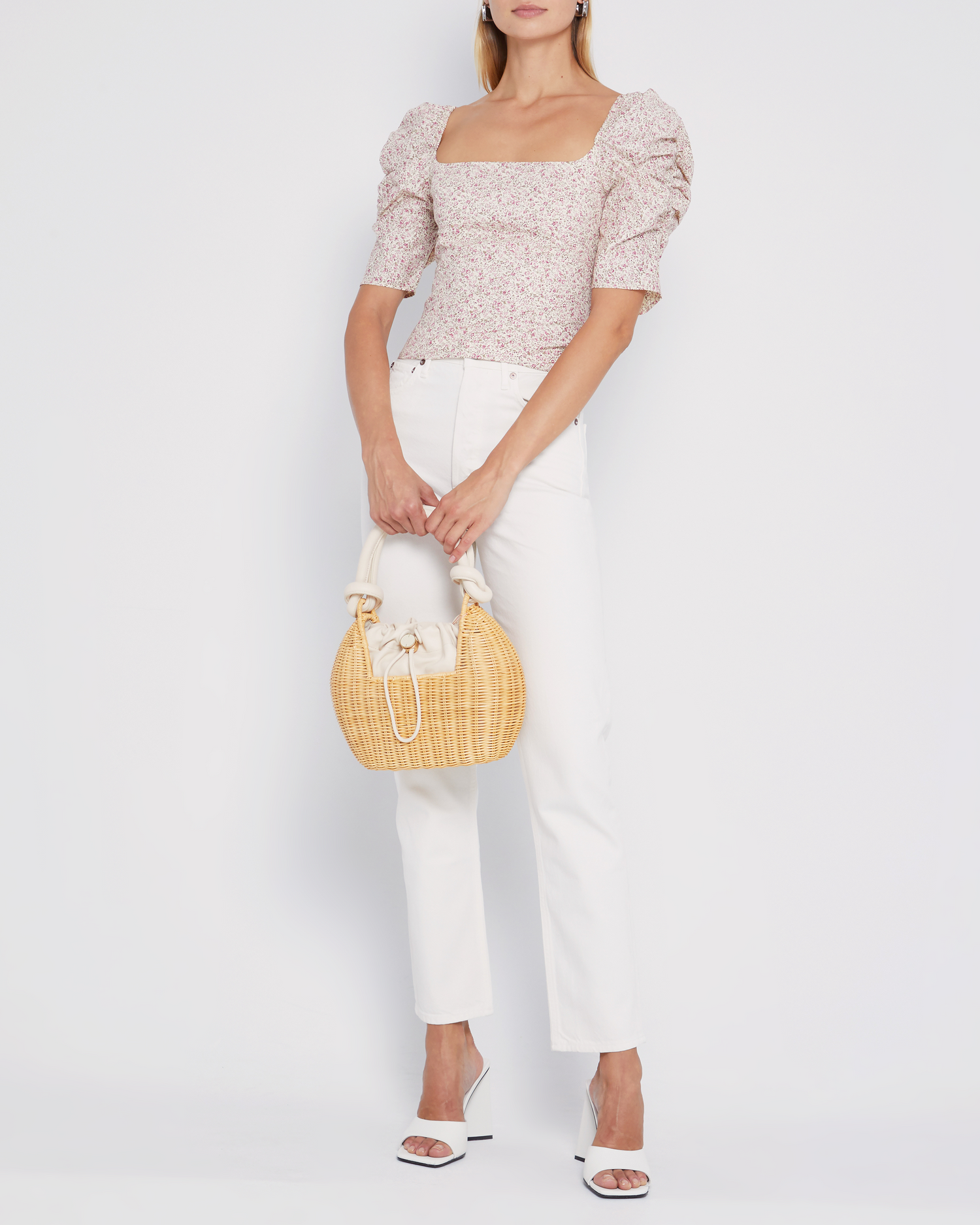 Gorgeous, ruched sleeves create a pretty silhouette for this cotton blouse. Done with a fitted bodice.