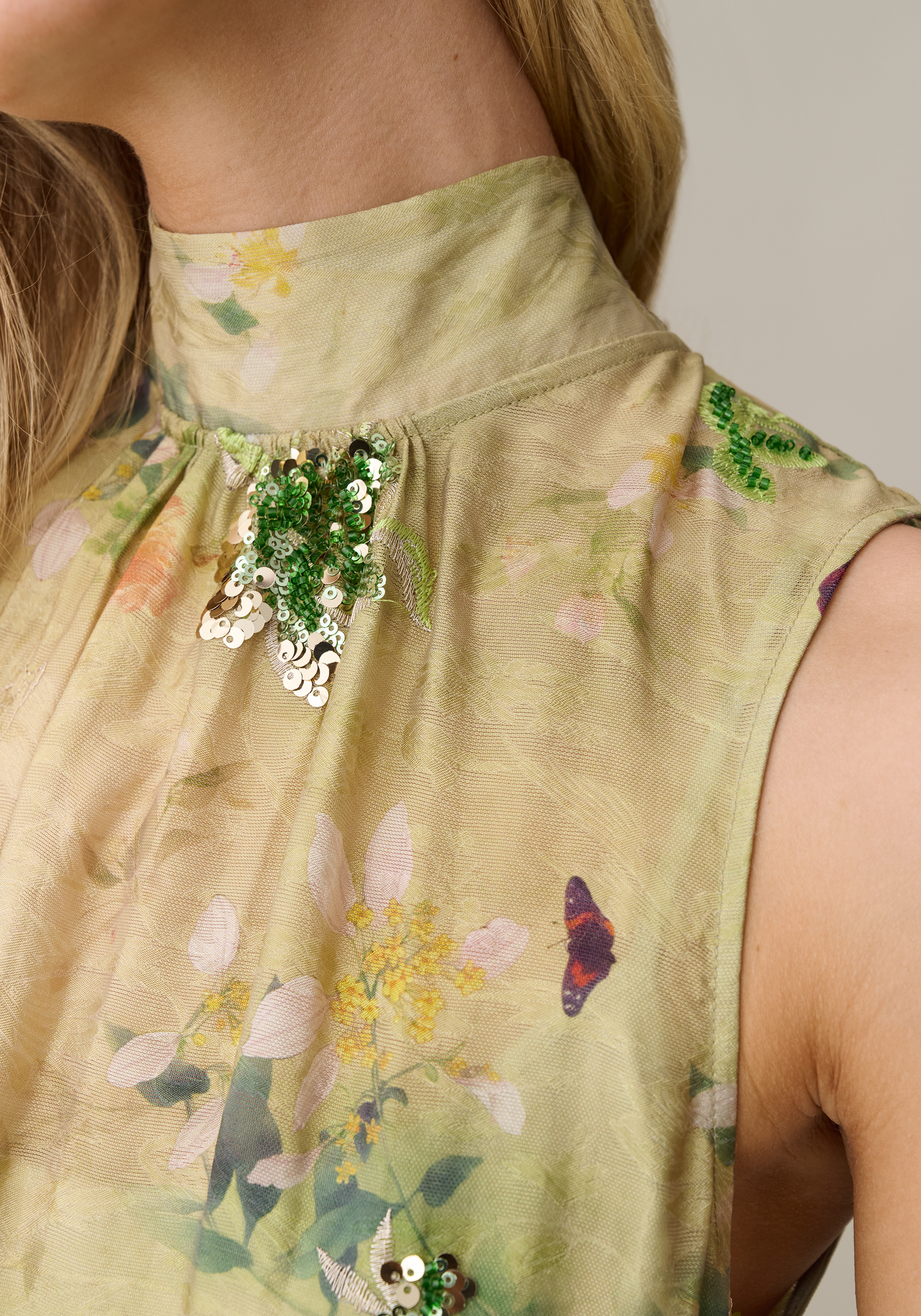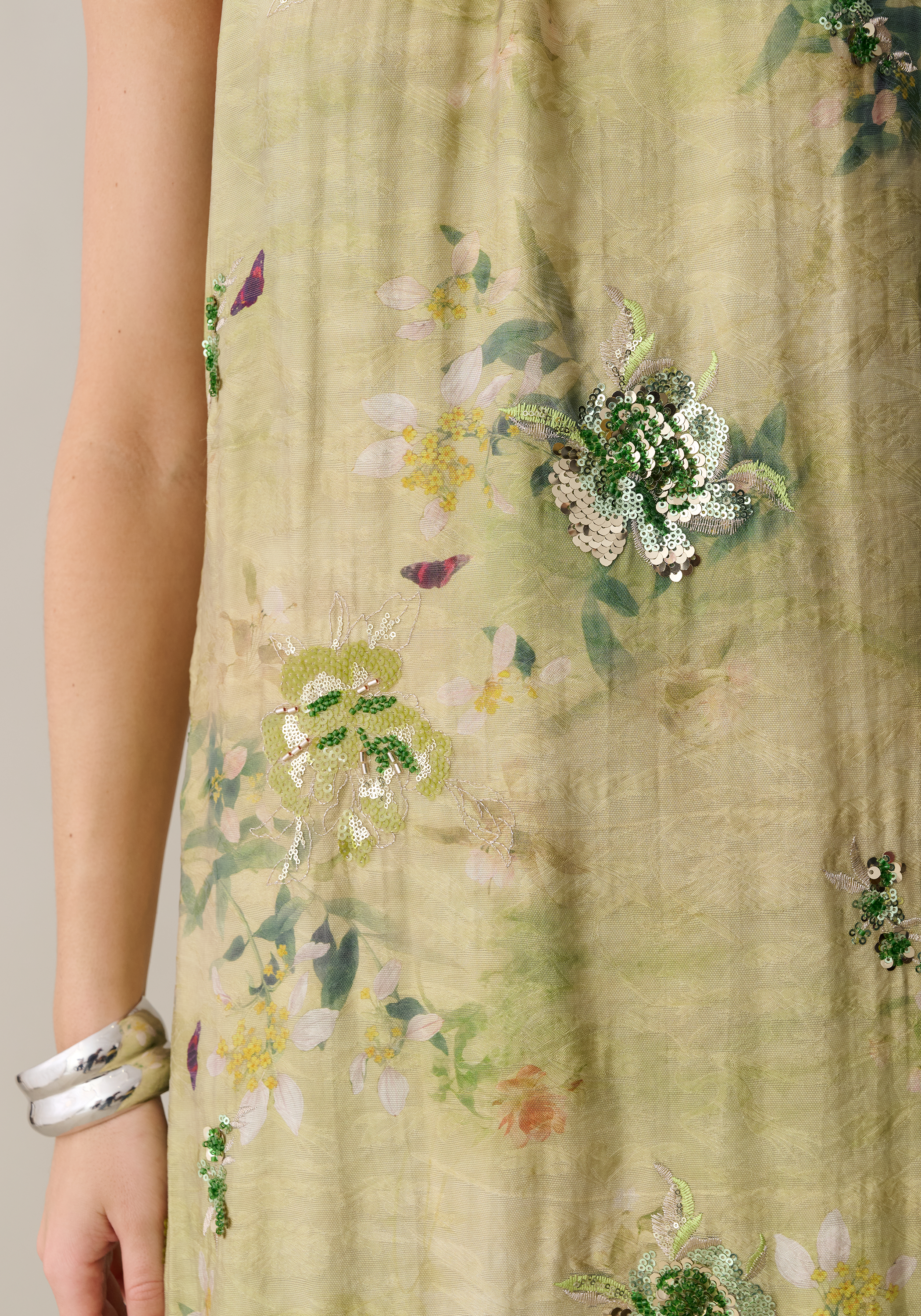 The Naia Dress features an elegant silhouette with a high neckline, crafted from airy organza. Its delicate feathered details add a playful touch, making it a sophisticated choice for special occasions.