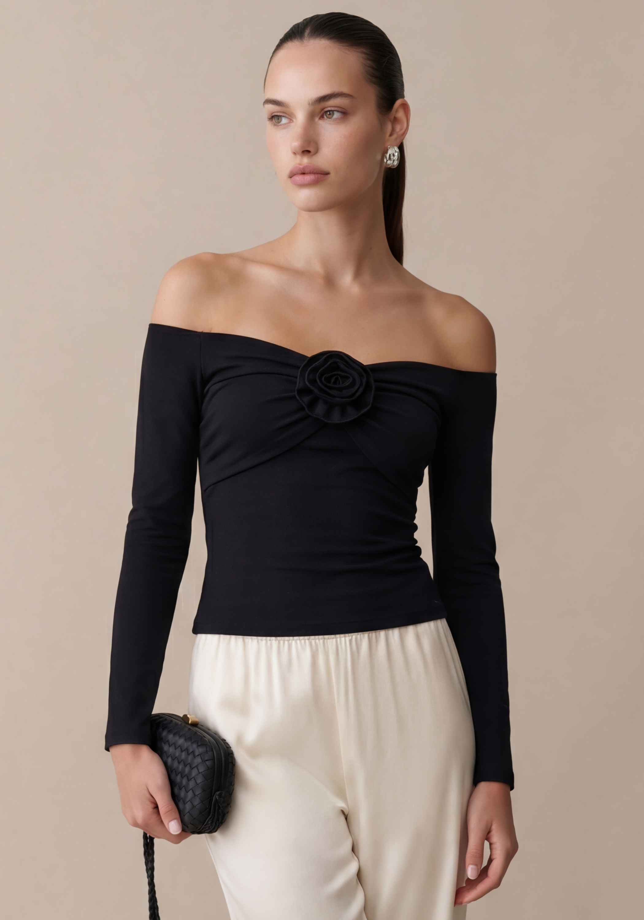The Nameera Top is a stylish and comfortable choice for any night out. Crafted with a soft and stretchy fabric, it features an off-the-shoulder design with a romantic rose detail.