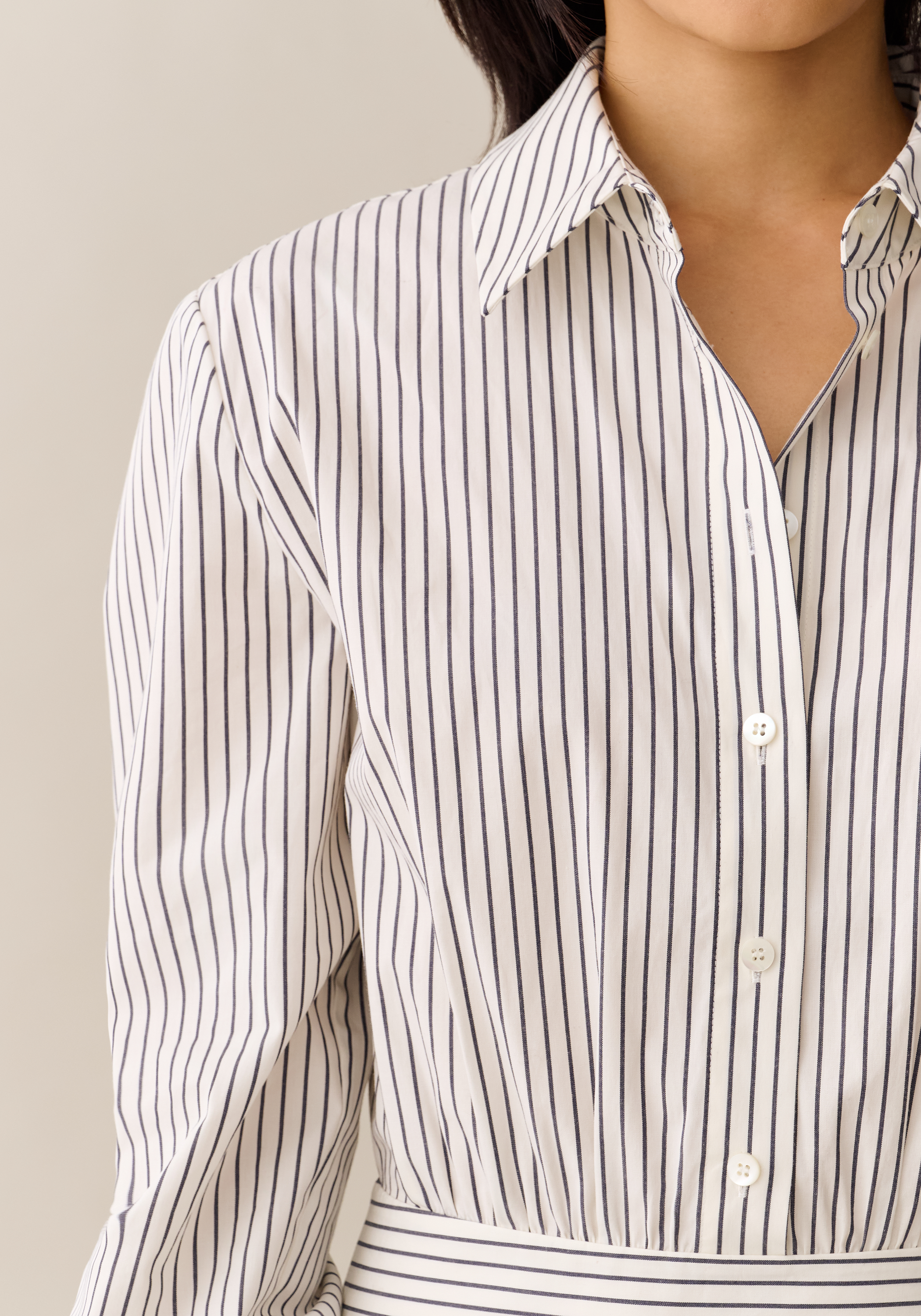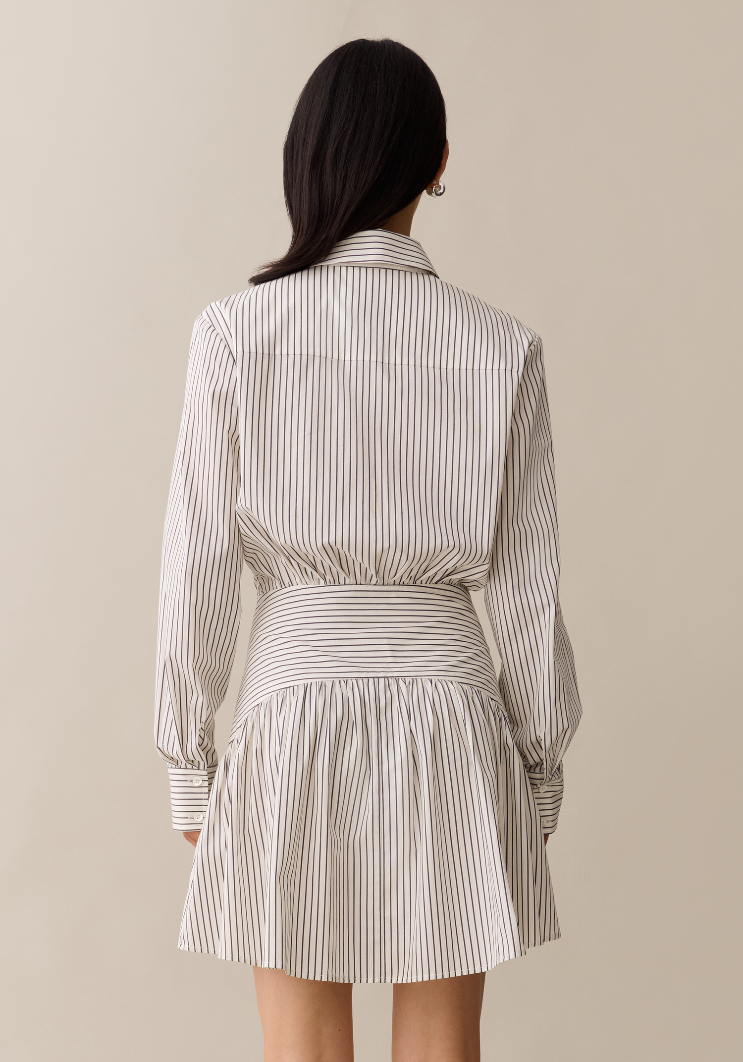 The Nolira Cotton Dress combines a cool cotton blend fabric with a classic collared button-up top for timeless elegance. Its fitted high-waist skirt contours the silhouette, delivering a sleek, snatched look.