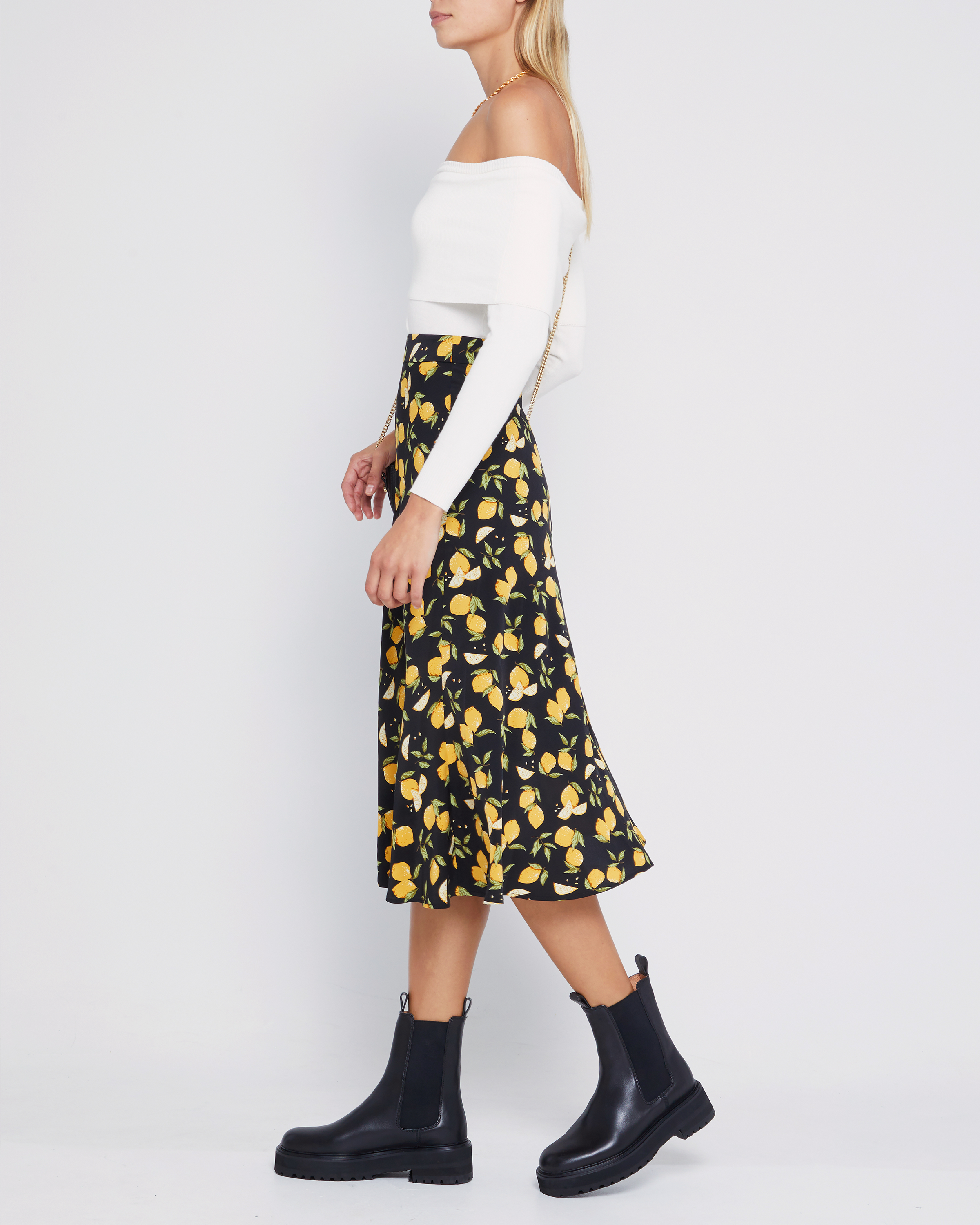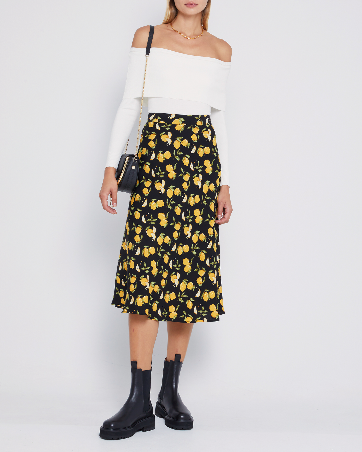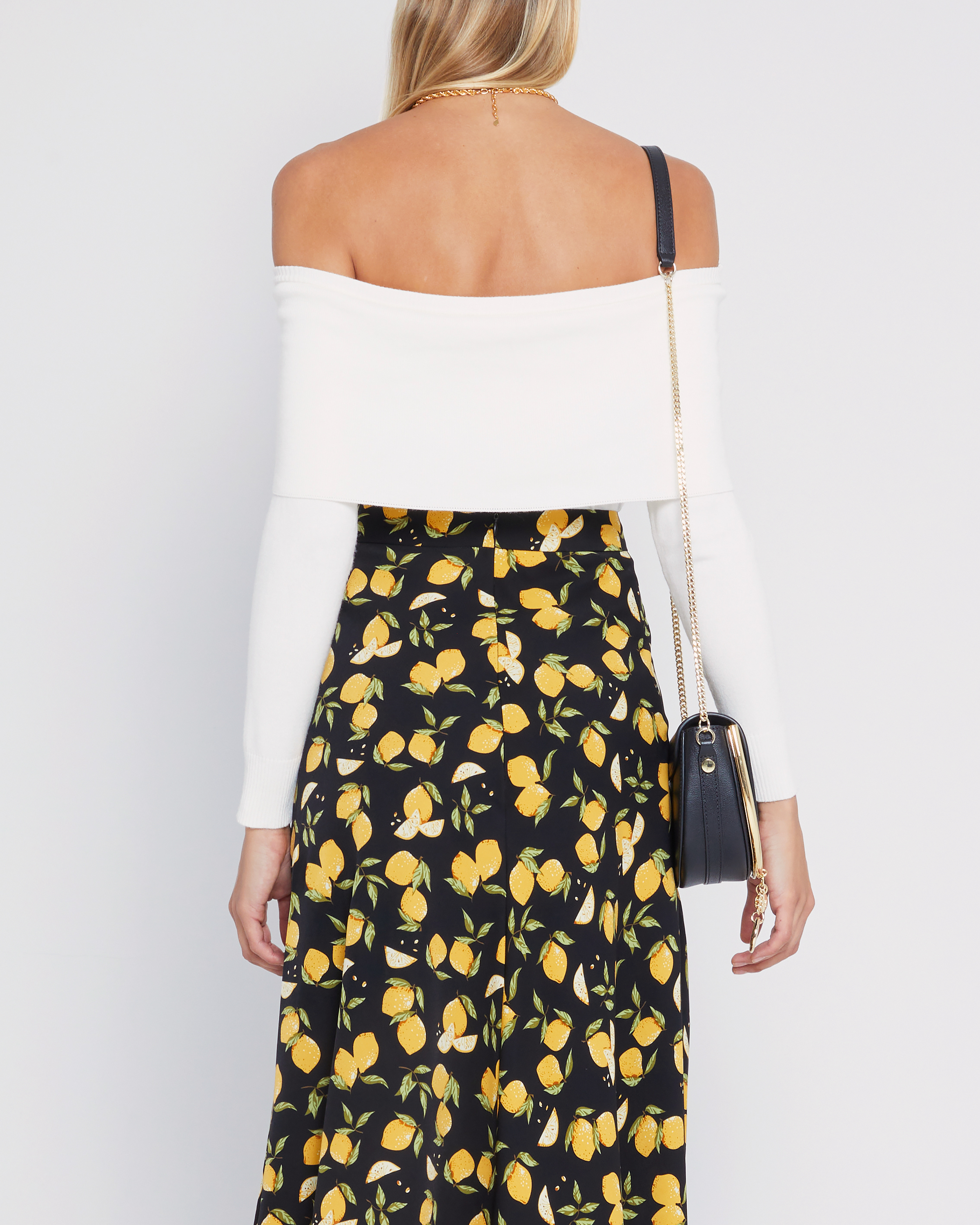 Feminine yet cozy, this sweet off-the-shoulder top is done with a folded, ribbed knit neckline.