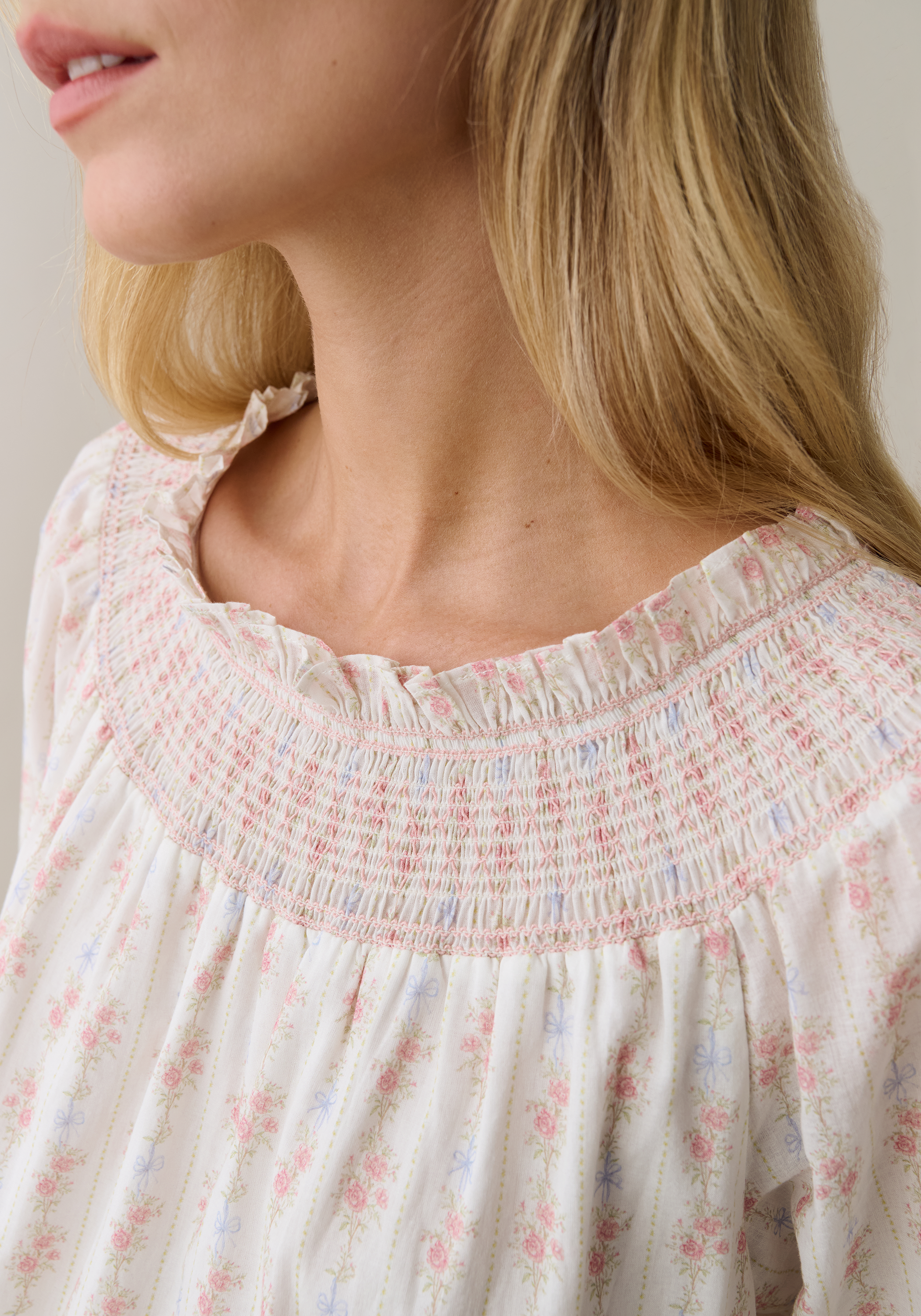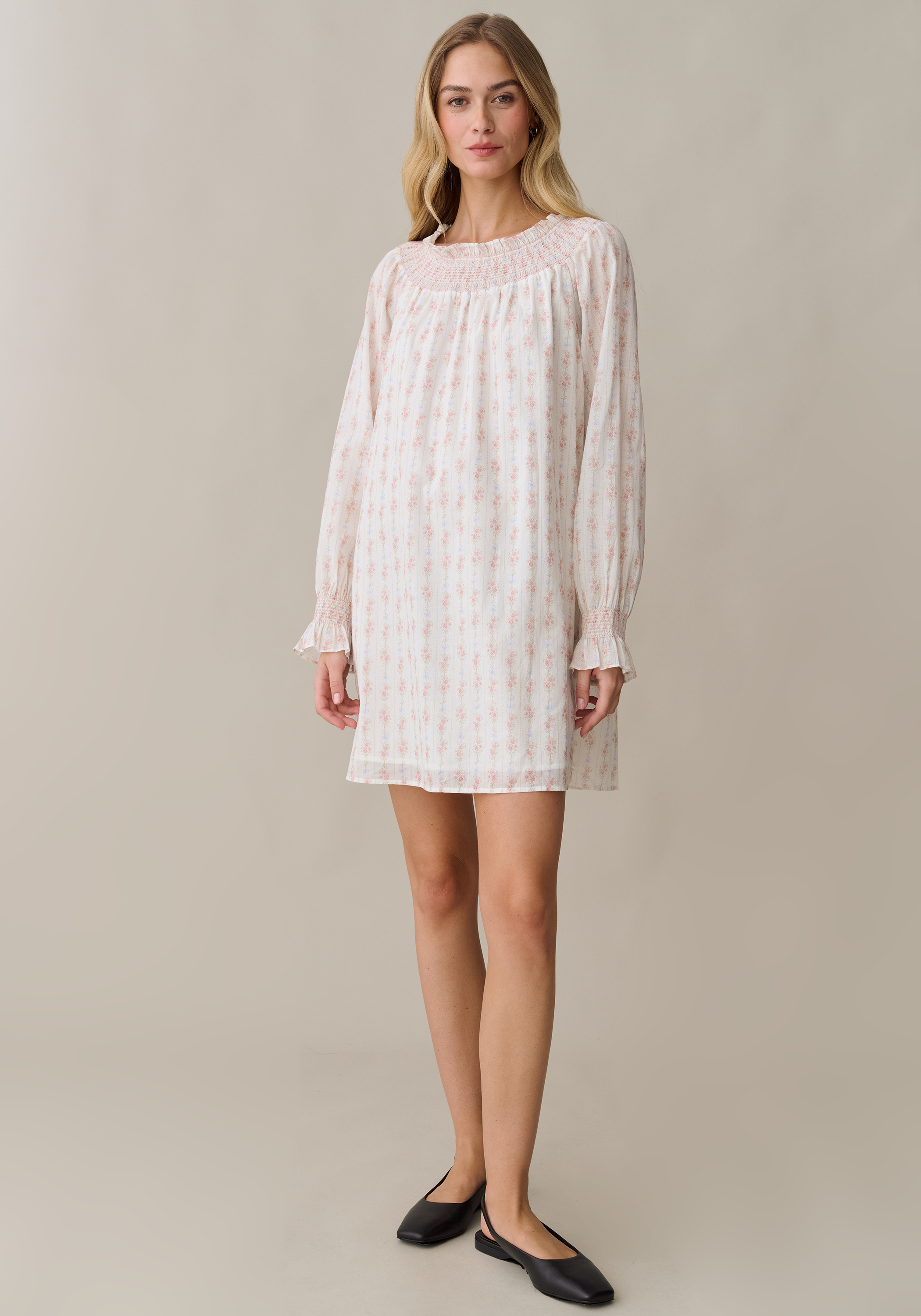 Designed with a gathered smock neckline and delicate ruffle trim, this mini dress offers a relaxed silhouette with an effortless feel. The smocked cuffs and long, airy sleeves add a touch of feminine structure to its comfortable, shift-inspired shape.