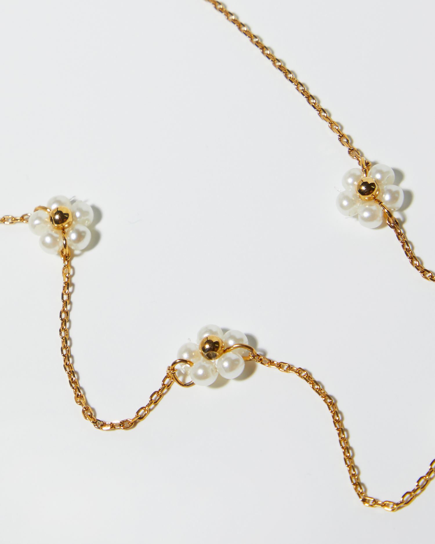 We love the charming design of this style. Delicate pearl flowers dot the length of this gorgeous gold necklace.