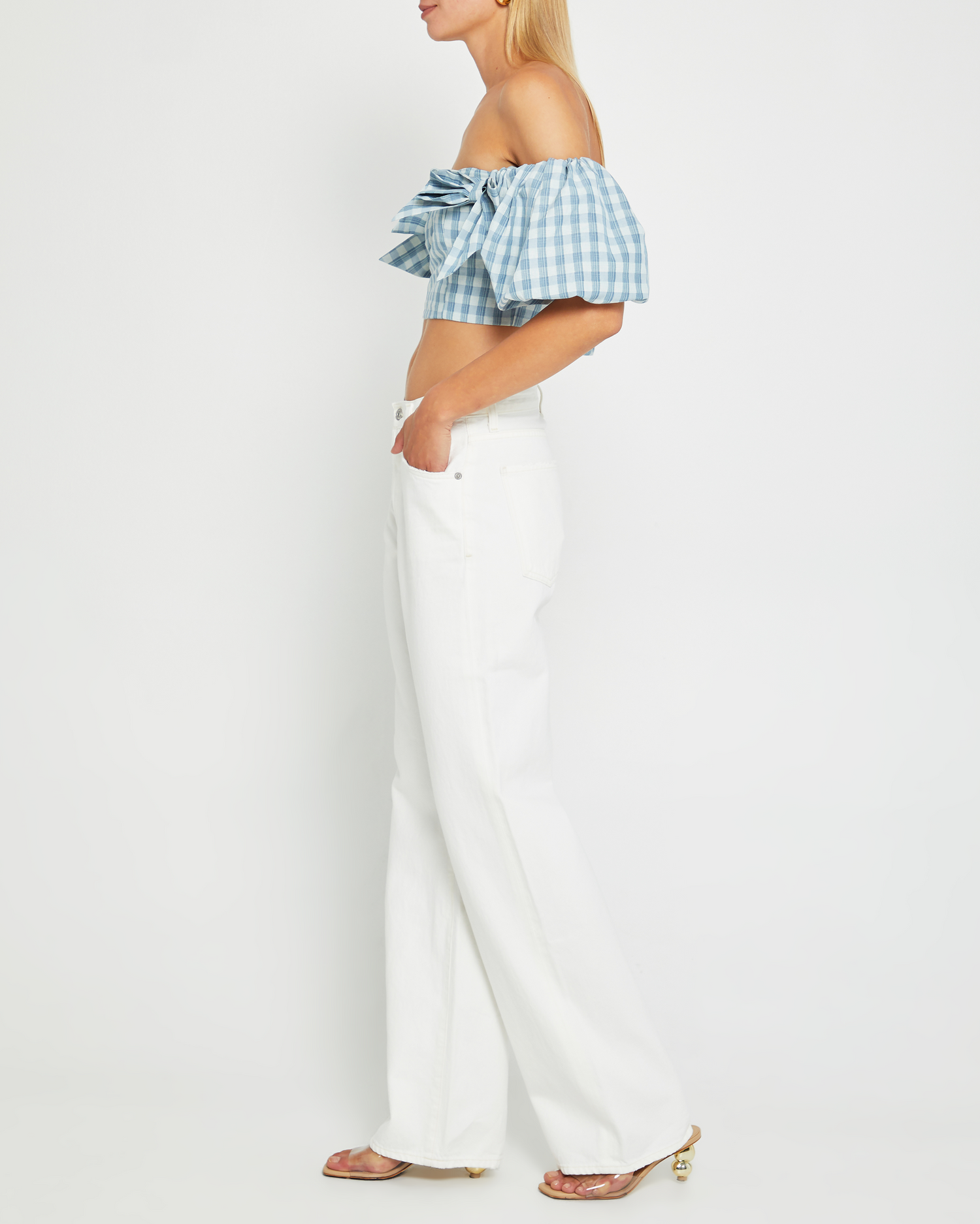 Look stylish and cute in the Petra Cropped Top. This off-the-shoulder number features puff sleeves and adorable bow details in a sweet plaid print for a classic look.