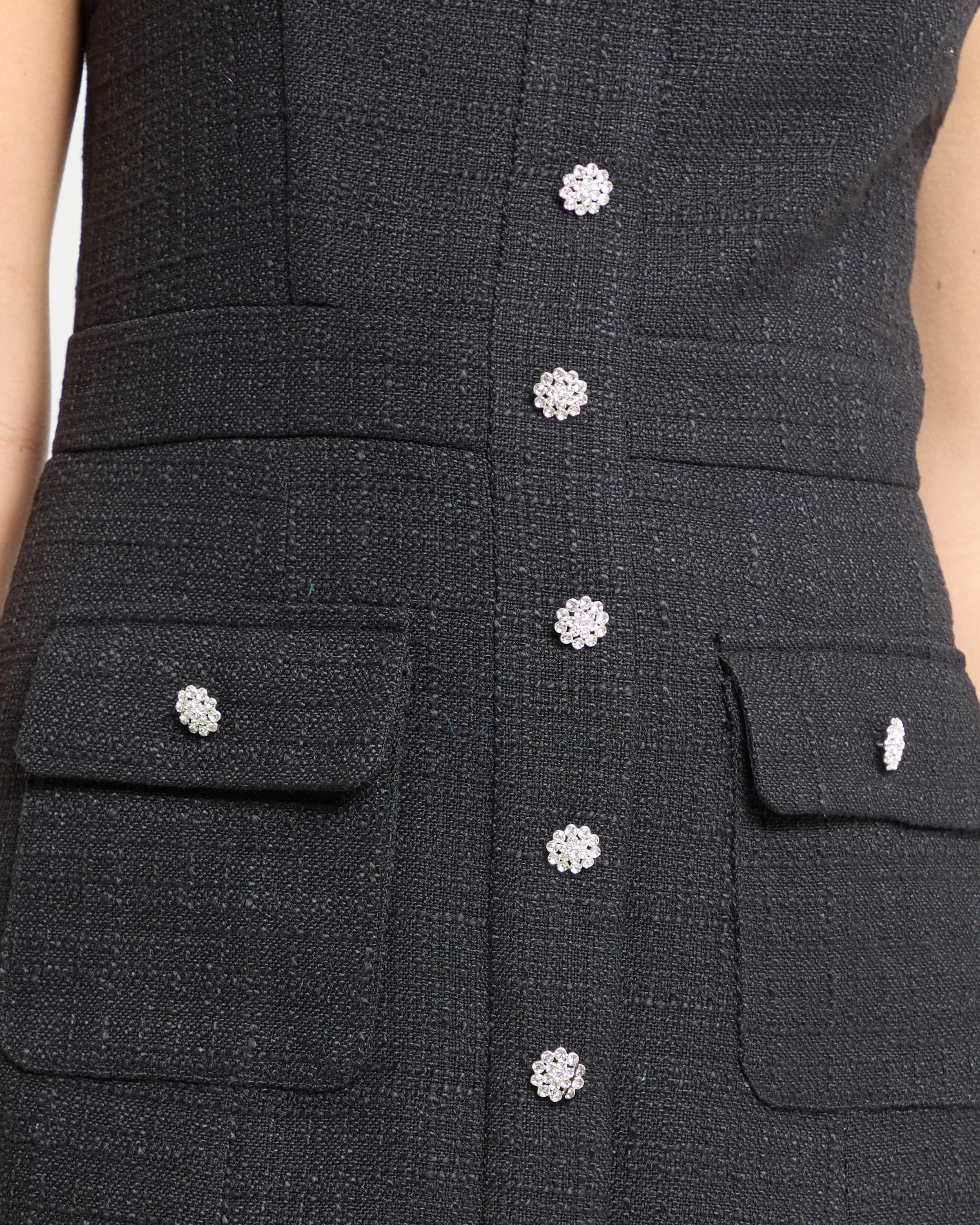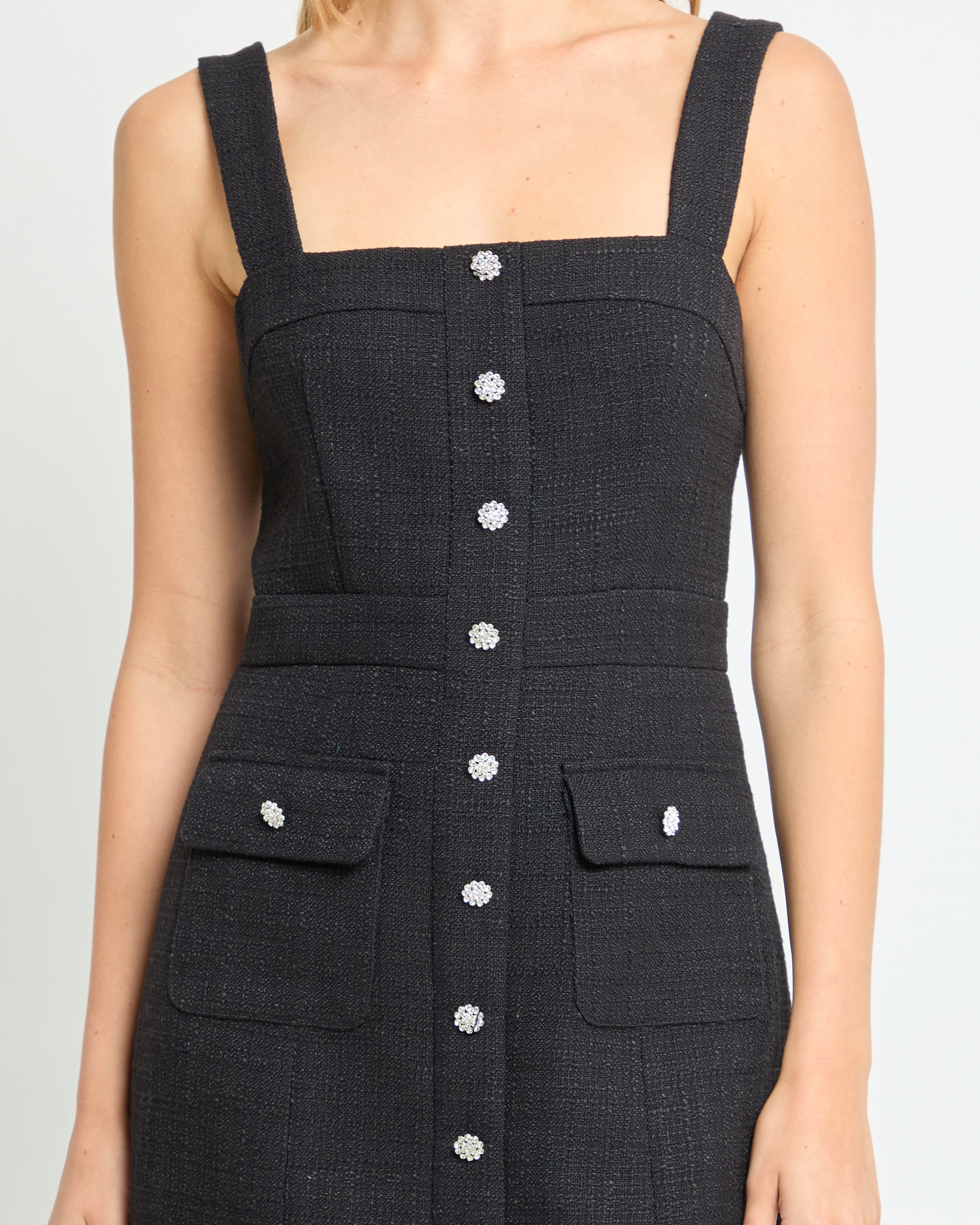 Introducing the Romy Mini Dress, featuring a structured shift silhouette and thick material for a flattering and elevated look. With front pockets and crystal button details, this dress feels like something special.