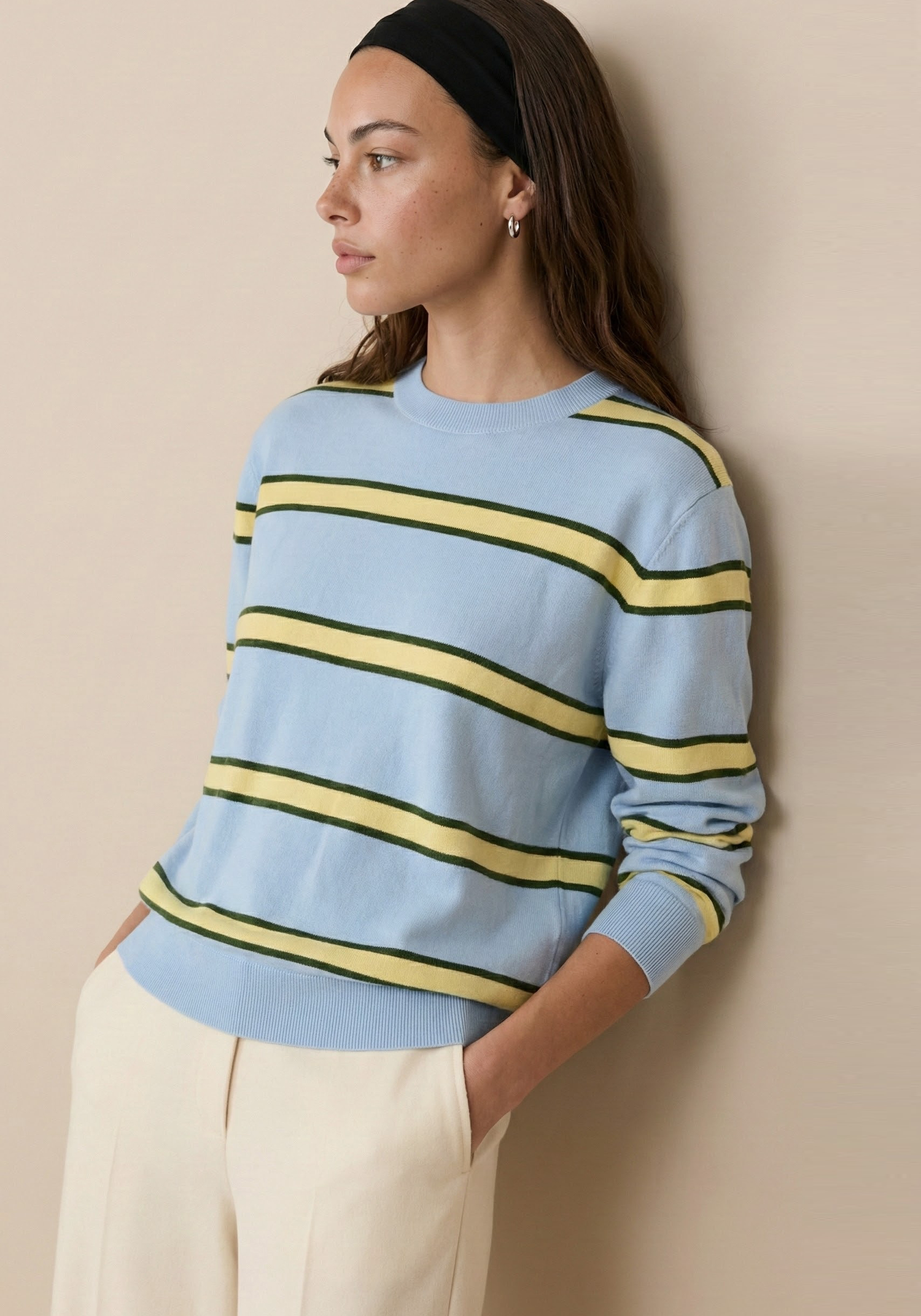 A lightweight cotton knit sweater with a classic crewneck and charming striped pattern. Perfect for layering, it offers comfort and versatility for everyday wear. The breathable fabric makes it an ideal choice for transitional seasons and casual styling.