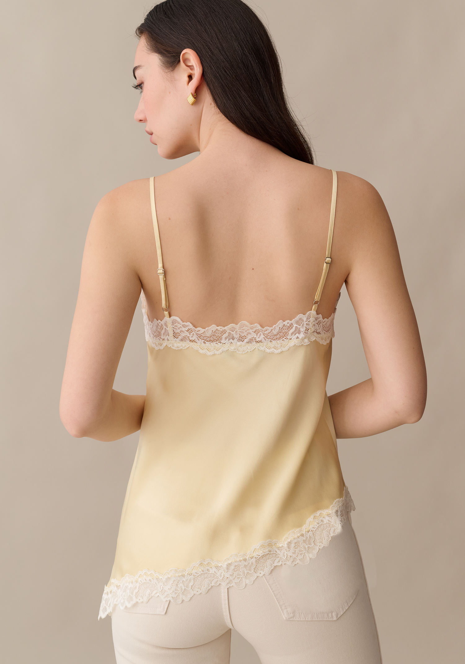 Slip into something silky with the Sasha Top. This cami features an asymmetric hem and cream lace lining that adds just the right amount of delicate detail. Layer it or wear as a standalone piece for instantly pretty looks.