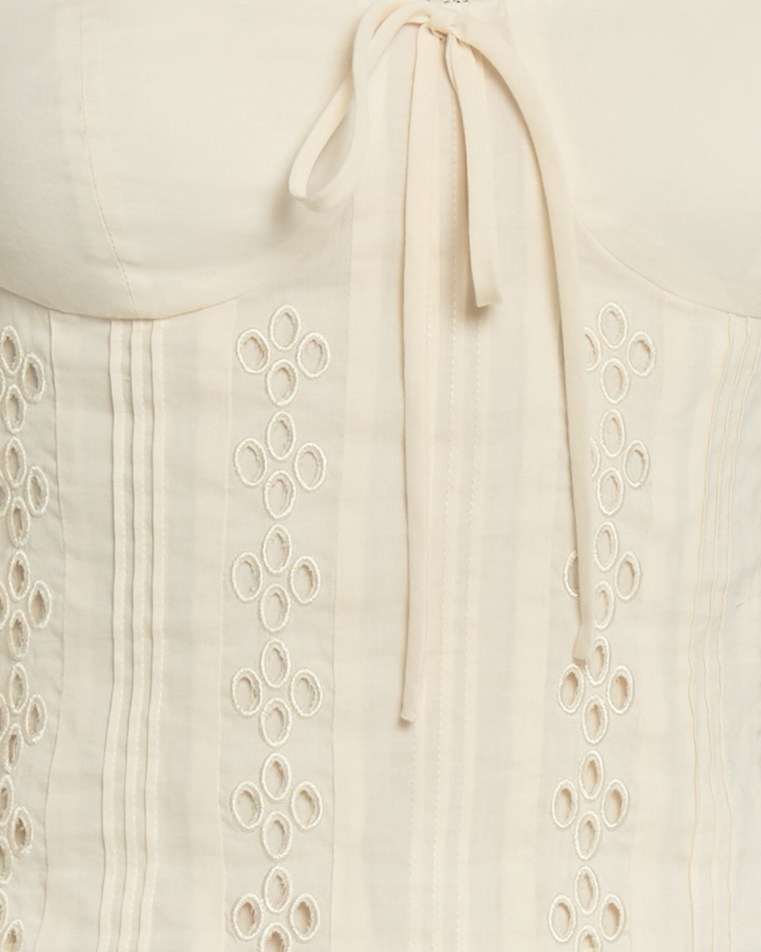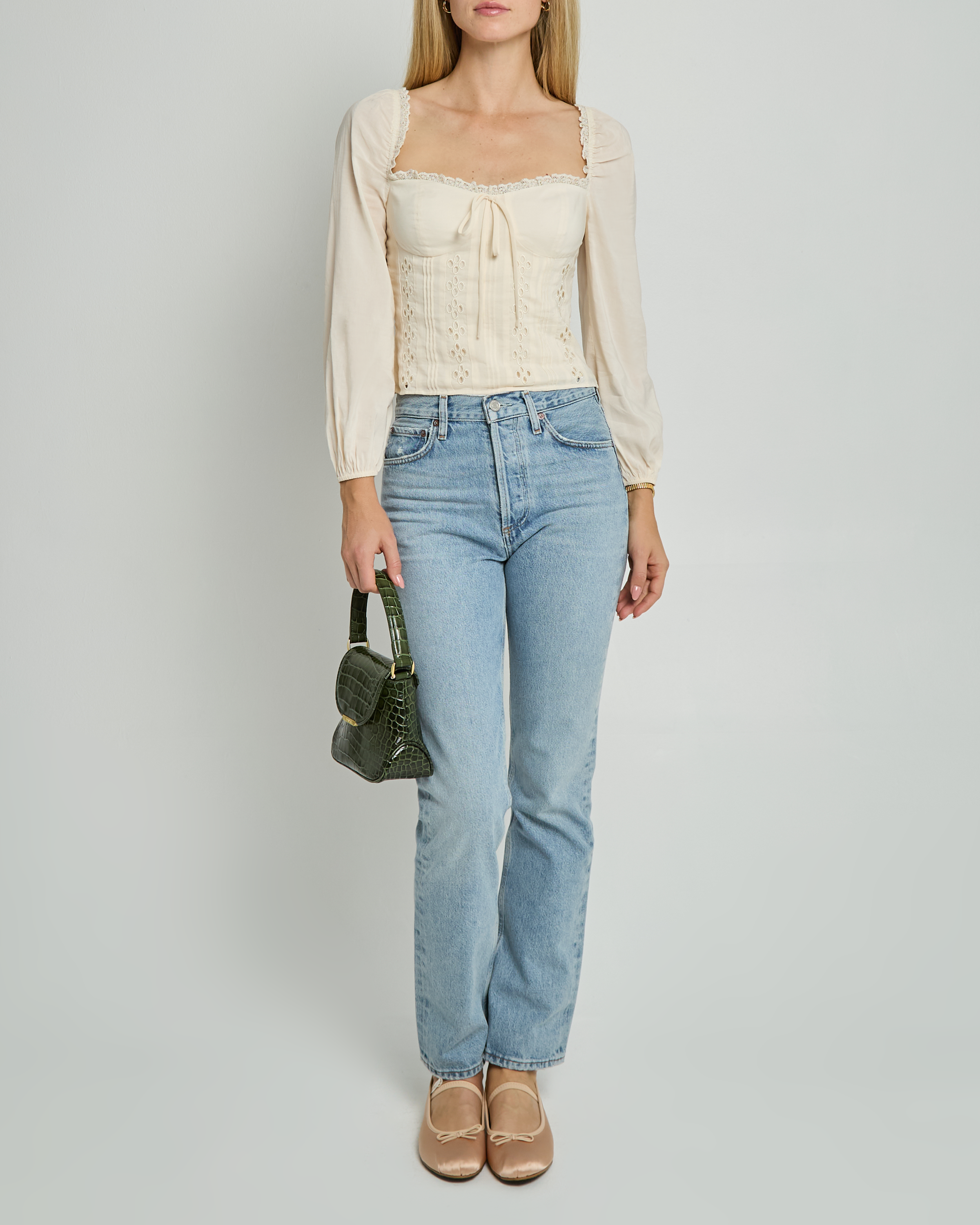 Expertly crafted in a beautiful soft cream hue, the Serenity Top  features intricate details and a delicate eyelet lace trim. With its long sleeves and fitted bodice, this blouse is both elegant and flattering.