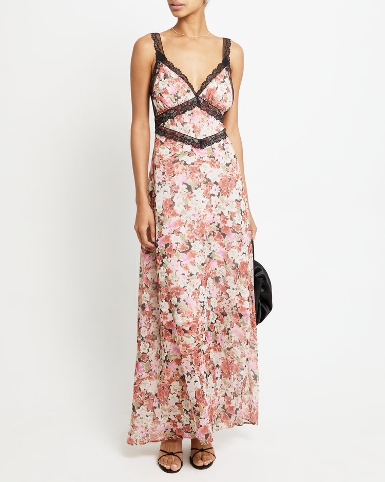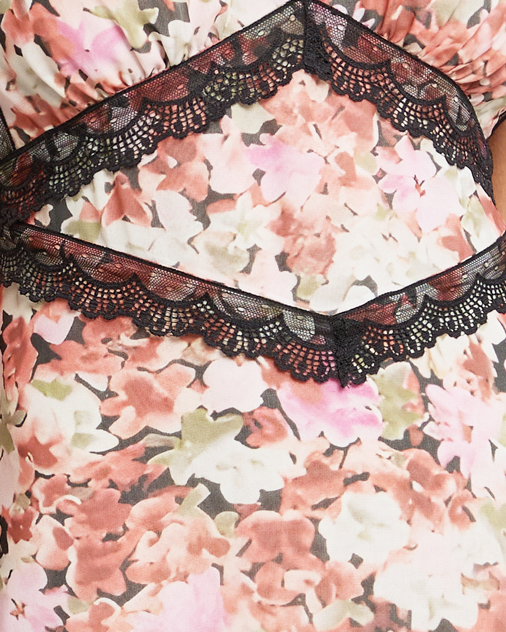 The Shanti Dress features a romantic floral print and delicate black lace trim for an elegant touch. Made from breezy chiffon, its low back with adjustable tie ensures a comfortable and customizable fit. Perfect for any occasion, this dress exudes effortless beauty.