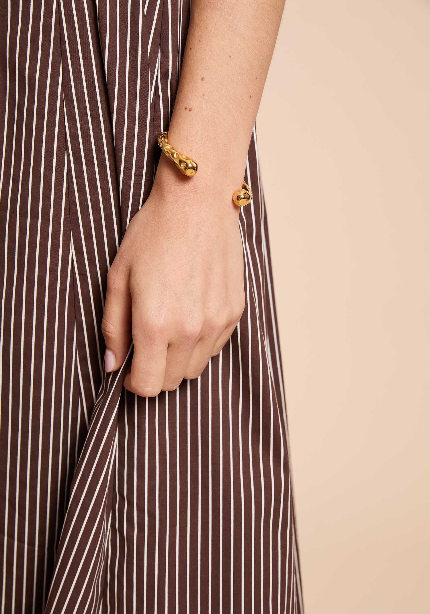 The Skinny Hammered Cuff Bracelet features a distinctive hammered finish that adds rich texture and visual interest. Its open design offers versatile wear options, allowing you to stack it with other pieces or wear it solo for a refined, chic statement.
