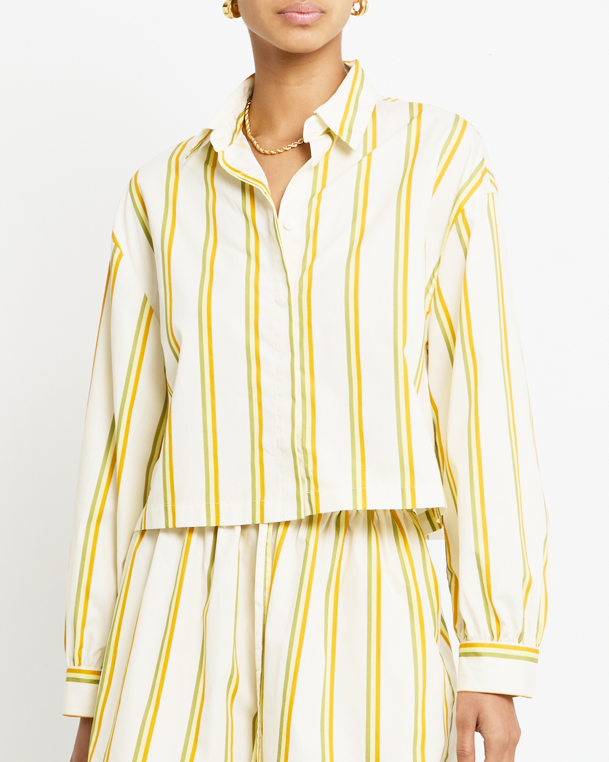 The Tatum Cotton Set offers a classic, yet relaxed look with its easy striped pattern and oversized fit. The elastic waist with drawstring adds comfort and versatility, while the button-up top completes the look.