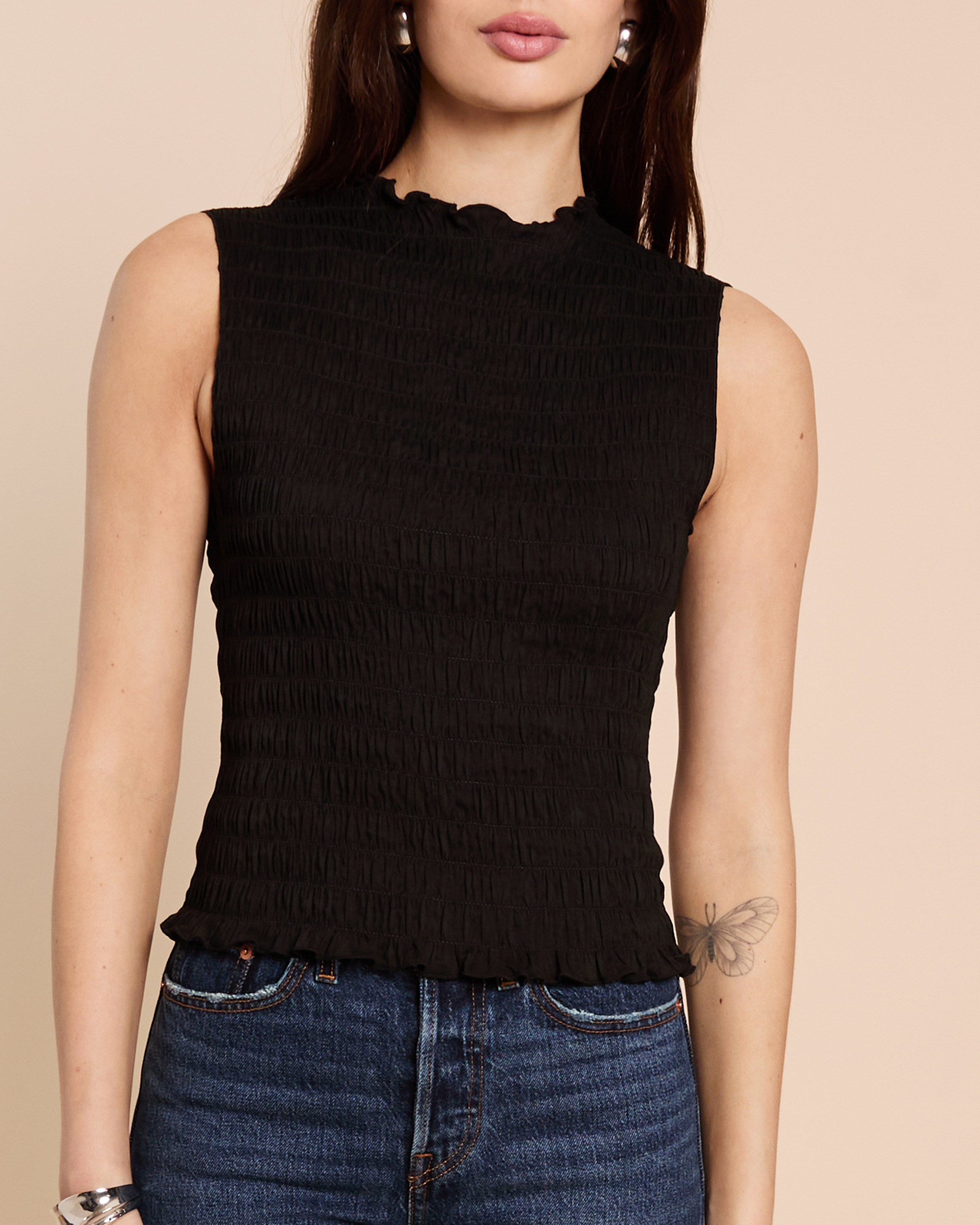 The Willa Top features a comfortable stretchy smocked bodice that creates an effortlessly form-fitting silhouette. Its chic high neckline adds sophistication to this versatile staple piece. Easily transition from casual to elegant by styling it up or down for any occasion.