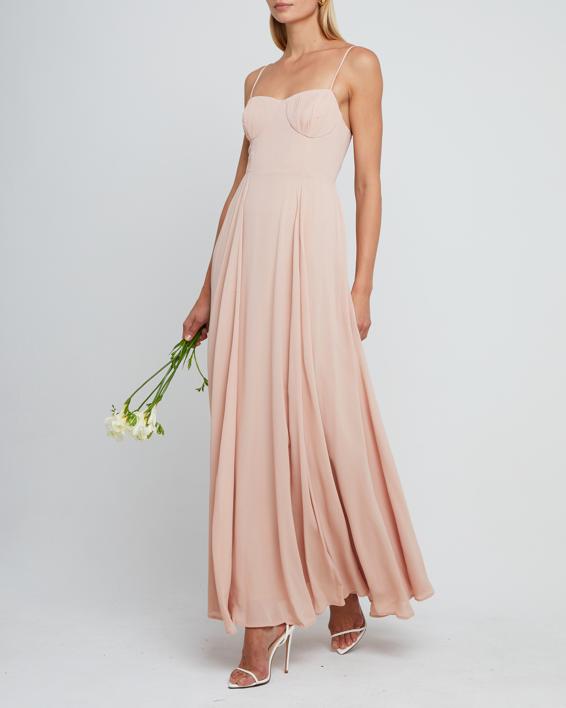 Third image of Winslow Dress, a pink bridesmaid dress with pleated cup detail, bustier style bodice, long flowy skirt, side slit, back zipper, adjustable straps, lining, and sweetheart neckline